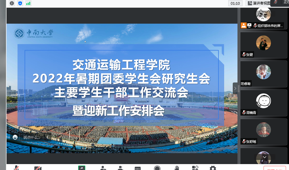 2022年8月24日下午3点,suncitygroup太阳集团2022年暑期分团委、学生会、研究生会主要学生干部工作交流会暨迎新工作安排会于线上顺利举行,会议由分团委组织部林伟主持,团委副书记张健老师和郑繁简老师、2022级辅导员陈晨老师、2022级辅导员丁德孝老师,分团委、学生会、研究生会主席团和各部门部长参与。会上,各学生干部依次发言,就本部门工作总结、现存问题和未来发展的思考进行深入交流。