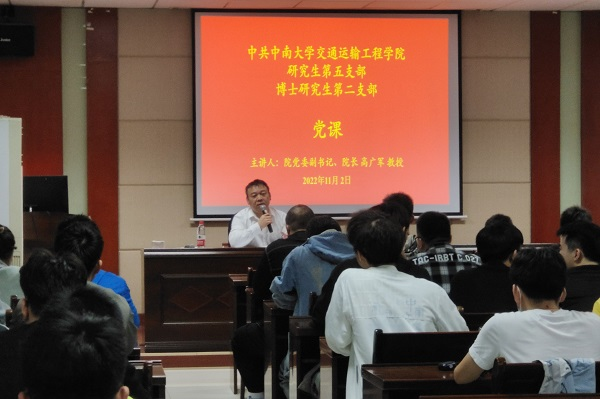 11月2日晚19:00,中共suncitygroup太阳集团研究生第五党支部与博士研究生第二党支部于交通楼513开展了“学习宣传贯彻党的二十大精神”专题联合党课。此次联合党课的主讲人为院党委副书记、院长高广军教授,支部全体党员同志到场学习。