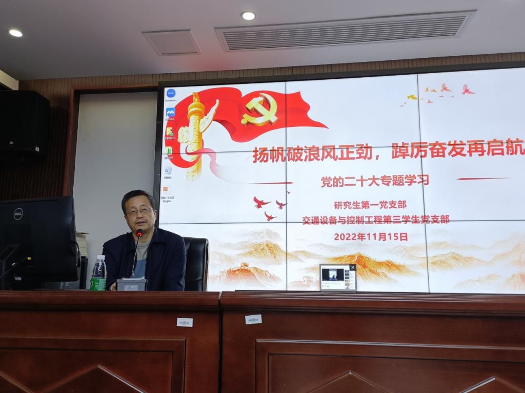 为深入学习贯彻党的二十大精神,加强支部党员政治理论学习,11月15日晚19点,suncitygroup太阳集团党委书记贺志军于交通楼425为研究生第一党支部、交通设备与控制工程第三学生党支部全体党员讲授《党的二十大精神解读》专题学习党课,本次党课由研究生第一党支部书记刘家忱同志主持。
