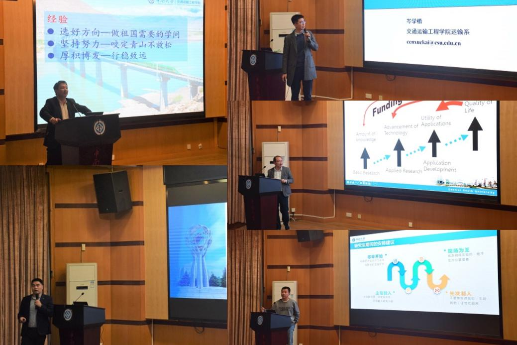 随后,学院各系所老师上台分享学术经验。成庶老师就不同研究方向的可能就业企业、用户单位及科研院所进行了讲解,并围绕“主动、合作、全局观、果敢”四个关键词谈论了自己的个人研究经验。易兵老师围绕高水平期刊推荐、学术科研经验分享、发展前景与就业方向等方面进行了分享,强调了阅读科技论文的三步法。岑学楷老师结合自身经历从期刊推荐、英文论文写作、留学深造与考研保研申博等方面进行了分享。李双琳老师结合物流工程的学科特色,分享了相关的中英文高水平期刊,并阐明了科研选题的顶层设计的内涵。王中钢老师从自身与铁路结缘的经历谈起,强调了要选择祖国需要的科研方向,有咬定青山不放松的坚持以及厚积薄发、行稳致远的态度。