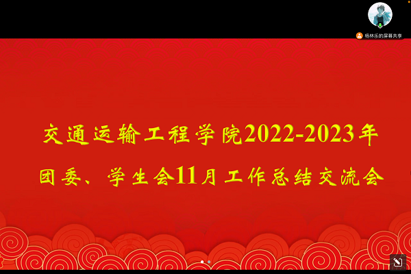 12月1日晚9:00,交通院团委学生会于线上举行了11月工作总结交流会,会议由院学生会主席杨林乐主持,交通院团委学生会各部门部长参加此次会议。会议上,团委学生会各部门部长结合工作实际依次发言,对11月的工作进行了系统且全面的总结,并对接下来的工作安排展开了讨论。